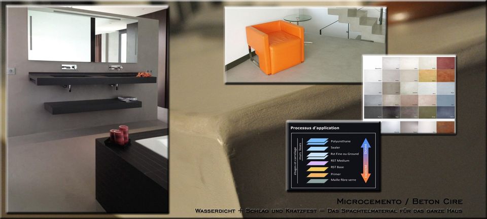 Legen Sie Wert auf außergewöhnliche Raumlösungen?     Dann ist Ihre Entscheidung für Micocement Wand- und Bodenbeläge genau richtig. Wir bieten Ihnen die Möglichkeit, Lebens- und Arbeitsräume so kreativ und exklusiv zu gestalten, wie Sie es wünschen.  Lassen Sie sich begeistern von der unendlichen Vielfalt edler Farbvariationen und schöner Strukturen der Beton cire / Microcement Oberflächen.  Das Ergebnis sind stilvolle, einzigartige Räume mit individueller Ausstrahlung.  Jeder Raum ein Unikat.  Alle ist möglich im Bad ohne Fliesen.Farblich gibt es fast keine Grenzen.  Für Kunden die den enormen Aufwand was das Entfernen der alten Fliesen mit sich bringt nicht in Kauf nehmen wollen.Für Sie gibt es die Möglichkeit direkt auf Fliesen das Microcemento Bzw. Beton Cire wasserdicht aufzuspachteln.     Die Anwendungsmöglichkeiten von Microcement Designbelägen kennen keine Grenzen. Sie lassen sich auf allen vorhandenen Untergründen wie Fliesen, Estrich, Gips, Glas, Metall, Naturstein oder Holzverlegeplatten auftragen. Die mineralischen Beläge, mit 96 % Naturanteil, können sowohl in neu gebauten als auch schon bestehenden Gebäuden verarbeitet werden – von privaten Wohnungen, Lofts, Ein- und Mehrfamilienhäusern über gewerblich genutzte Räume wie Hotels, Banken, Büros bis hin zu Cafés oder Restaurants.  Durch die hohe Beständigkeit und Belastbarkeit des eingesetzten Materials ist auch der Einsatz in Außen- oder Nassbereichen möglich, wie beispielsweise Wintergärten oder Spas. Dank des speziellen Herstellungsverfahrens kann das Material sowohl mit Fußbodenheizungen kombiniert als auch bei Bedarf zu einem frostsicheren Belag verarbeitet werden.  Neben fugenlosem Auftragen bieten Microcement Designbeläge auch die Möglichkeit, gewölbte und runde Flächen zu verschönern, Schriftzüge oder Logos einzuarbeiten. Ganz nach persönlichem Geschmack und eigenen Vorstellungen.  Das ist gelebte, kreative Freiheit.